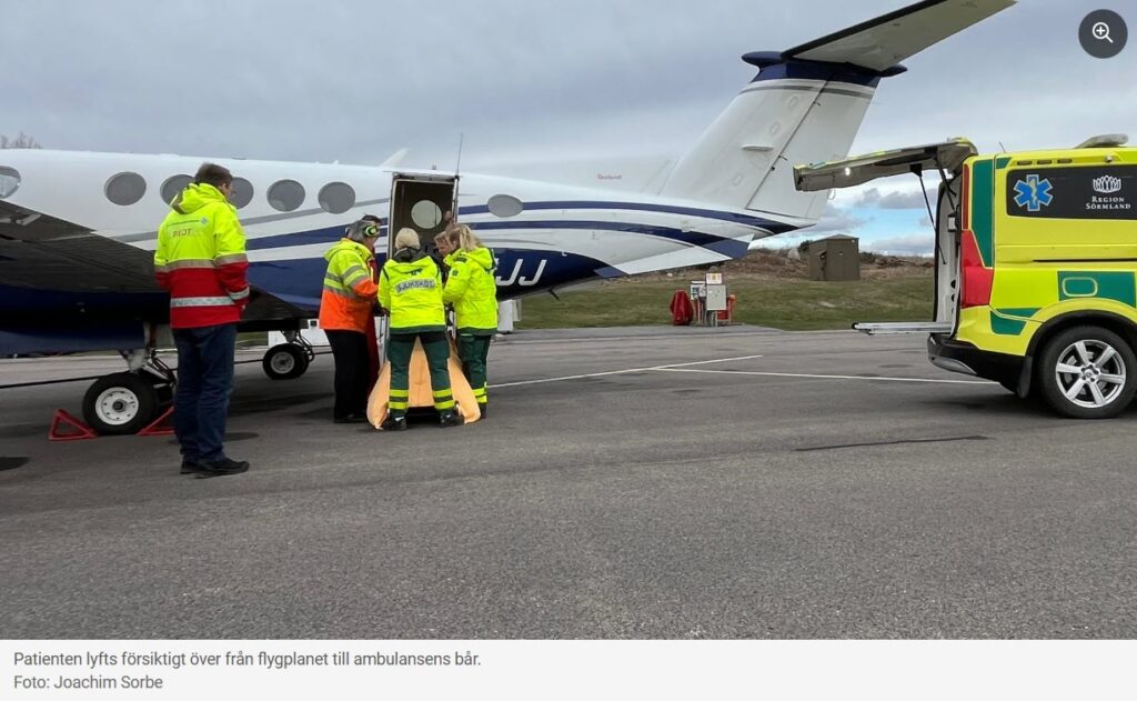 Bredvid start- och landningsbanan inne på flygplatsen väntar redan en ambulans på att köra patienten den sista biten till sjukhuset. Patienten ligger på en brits i det lilla flygplanet. När det har landat lyfter den norska sjuksköterskan och de svenska sjuksköterskorna försiktigt över patienten till ambulansens bår.